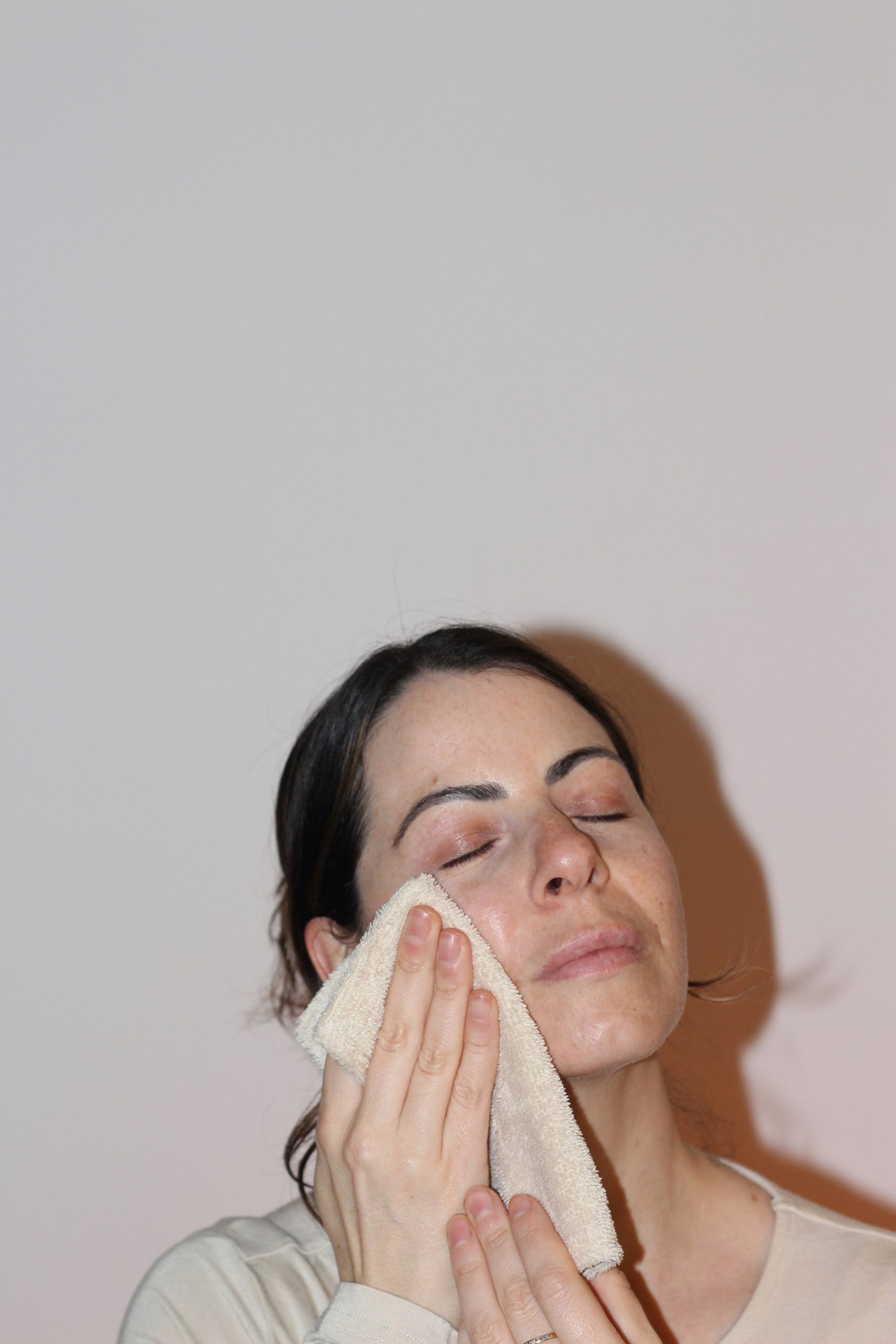 Humedece la toallita con agua caliente y colócala sobre el rostro durante unos segundos. El vapor liberará el aroma del bálsamo o limpiador.